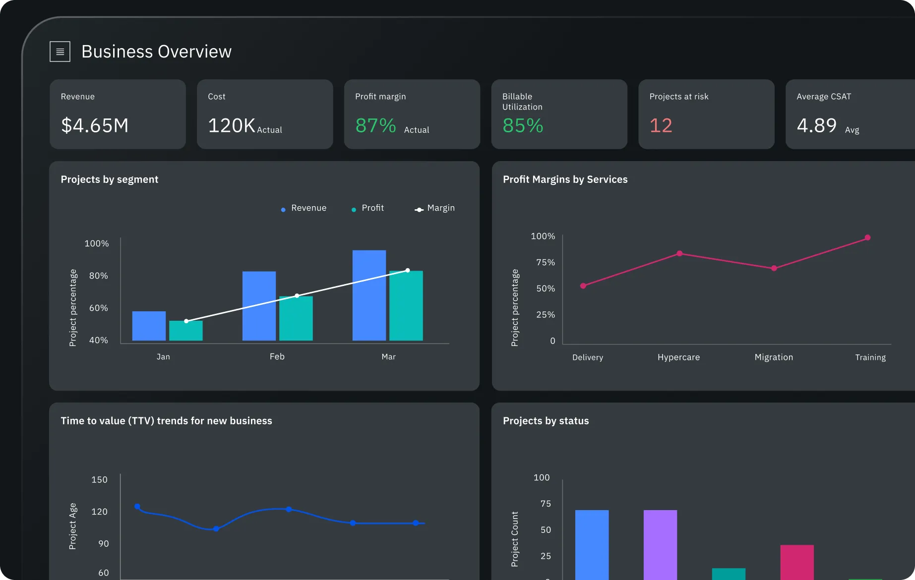 A real-time dashboard for revenue, project health, team performance, CSAT. All connected.