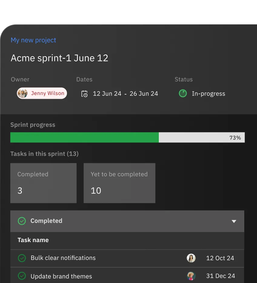 Set up, run, and track sprints with ease. Burndown charts, velocity reports, and real-time insights help you stay on top of progress, adapt quickly, and deliver better every time.