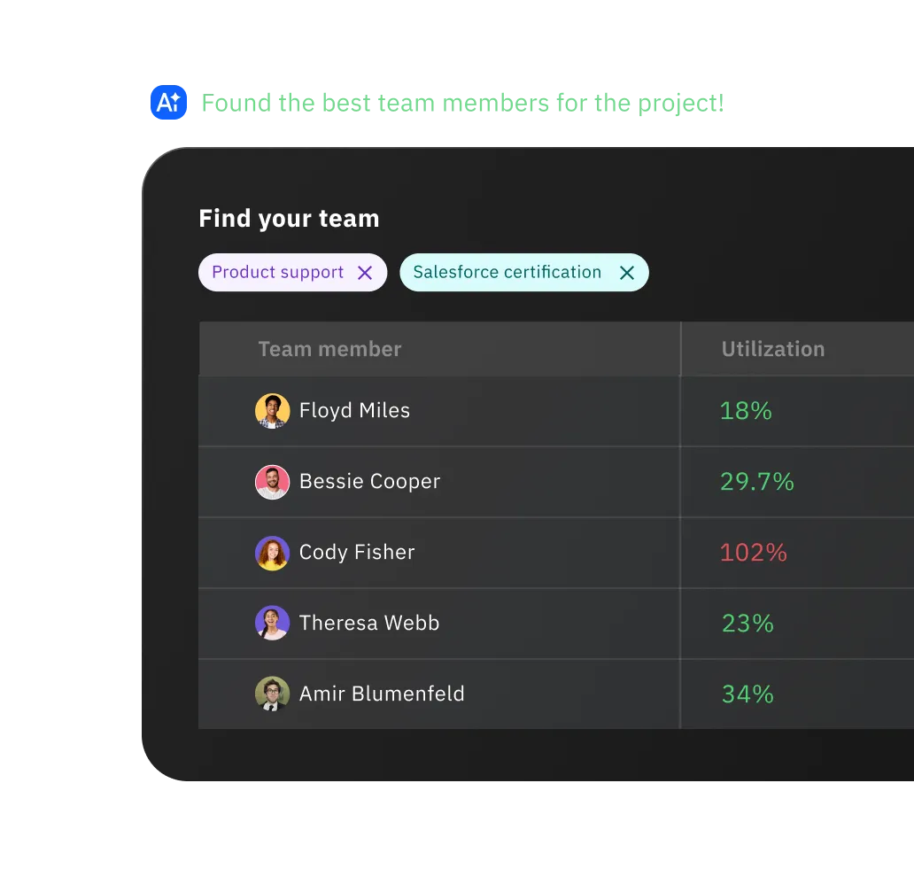 AI-powered tools match resources to project needs based on availability and skills, balancing workloads efficiently and reducing bench time.