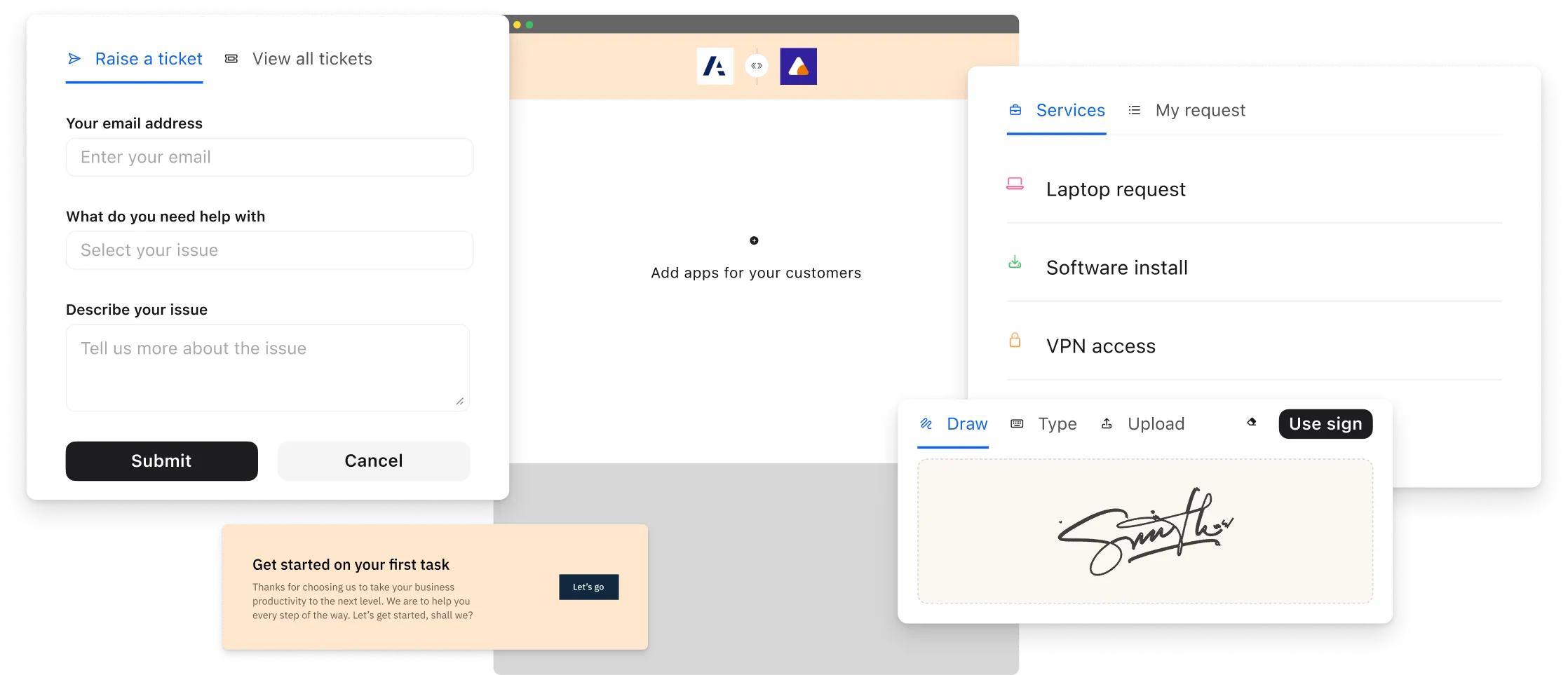 Whether it’s signing documents, raising support tickets or browsing your service catalog, everything comes together in one single place for your customers.