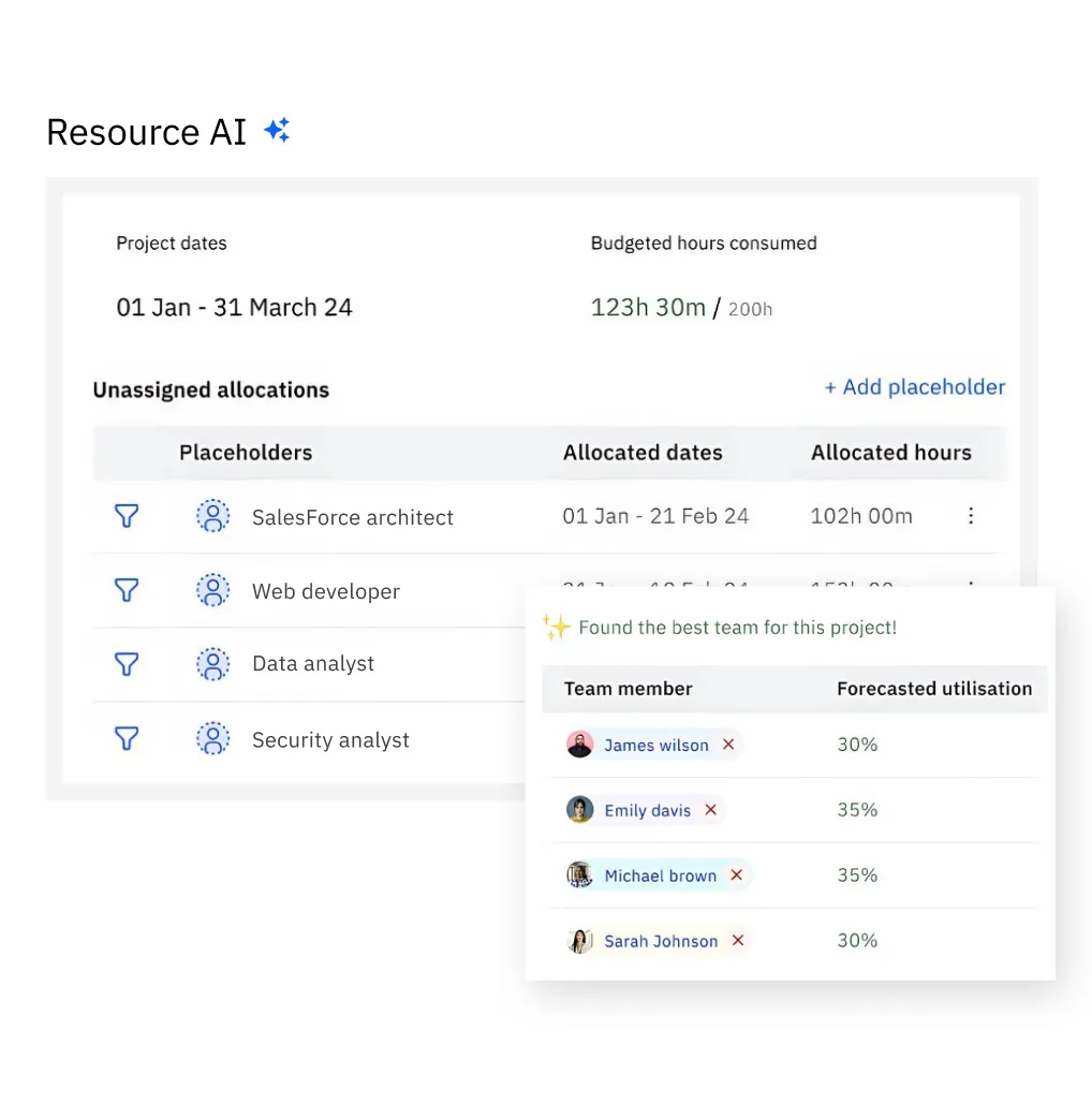 Resource AI pairs consultants to projects using skill and availability data for optimal results.
