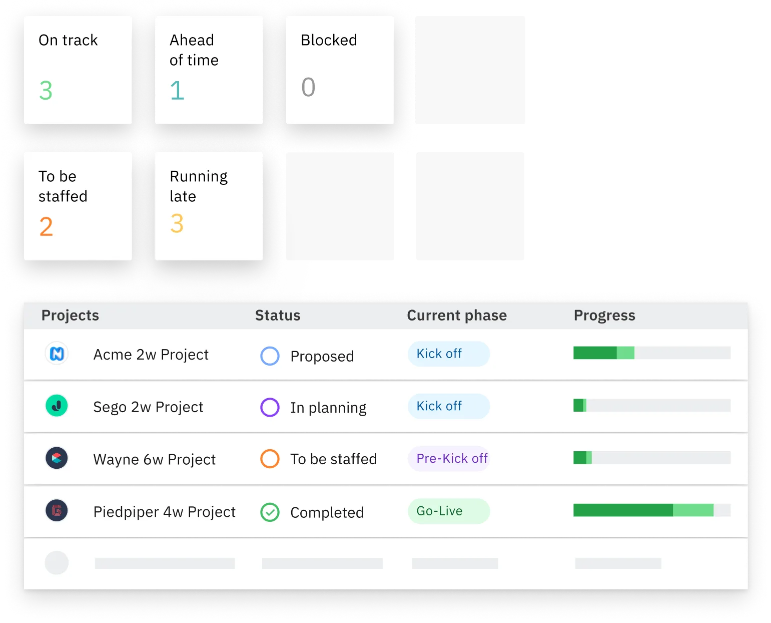 The Rocketlane projects dashboard gives you a birds-eye view of your entire project portfolio - you can check project progress, see which way updates are trending, which phases are causing delays, etc. and take timely corrective measures.