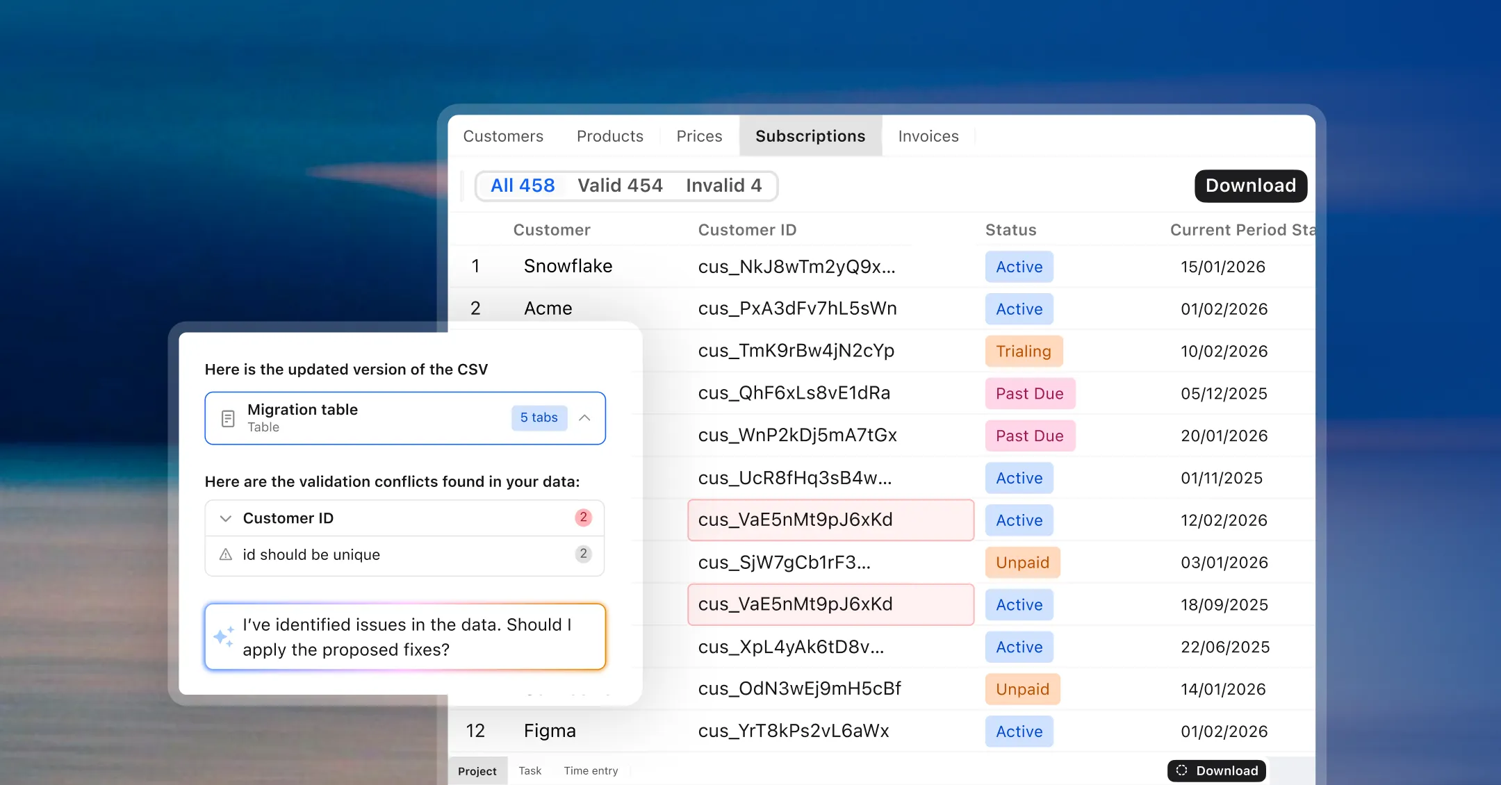 Understands where data needs to land and shapes it automatically. Suggests mappings, applies transformations, and runs migrations in a single guided flow—so your team isn’t buried in spreadsheets or one-off cleanup work.