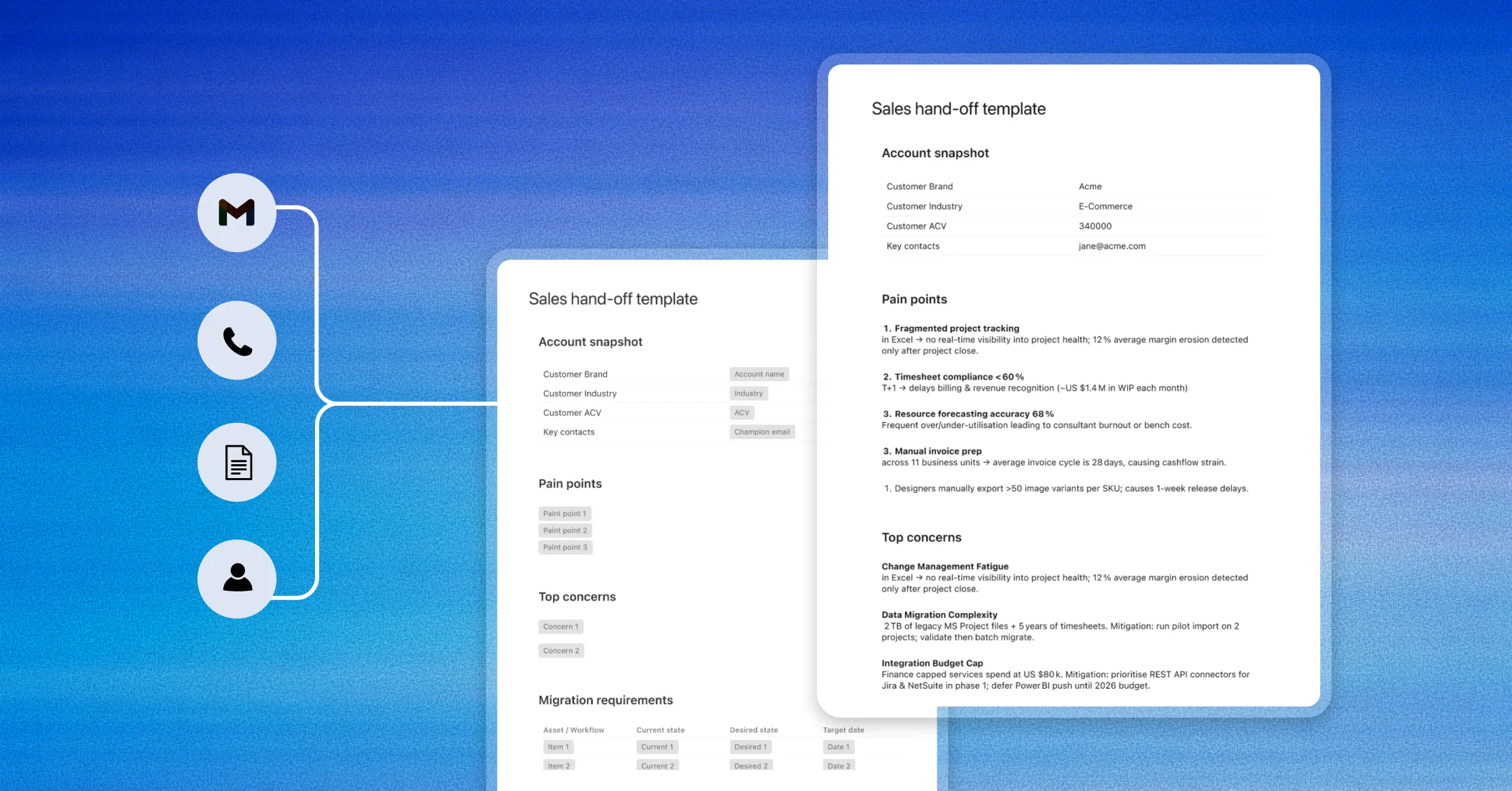 Joins calls, captures insights from emails and conversations, and turns them into the documents your team already relies on. Design specs, BRDs, handoff notes, status updates.