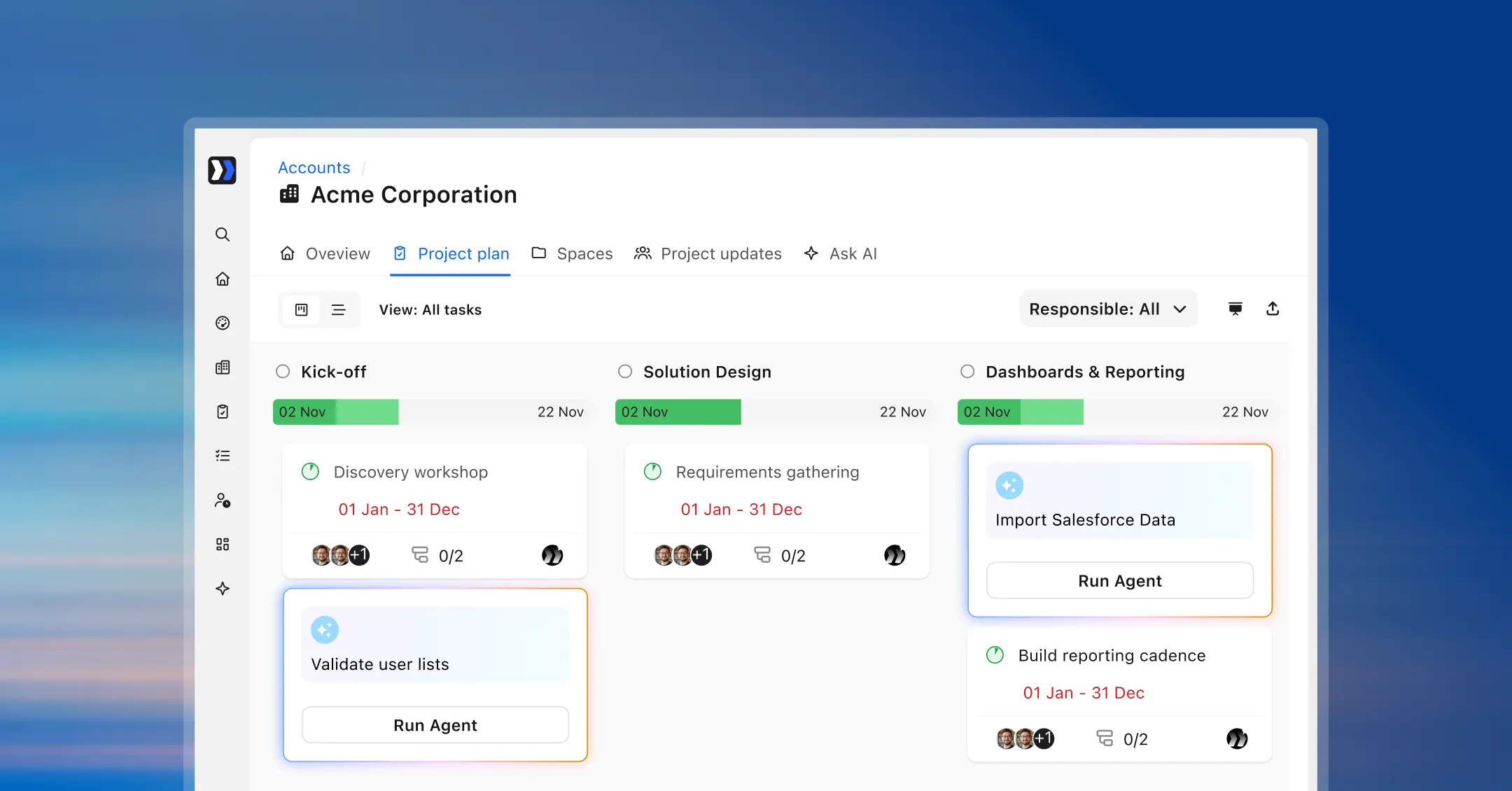 They run as part of delivery workflows, triggered when work needs to happen, not as a separate AI tool on the side.