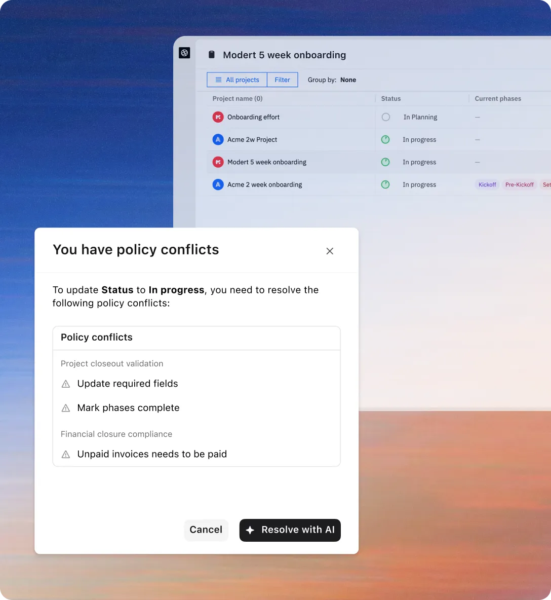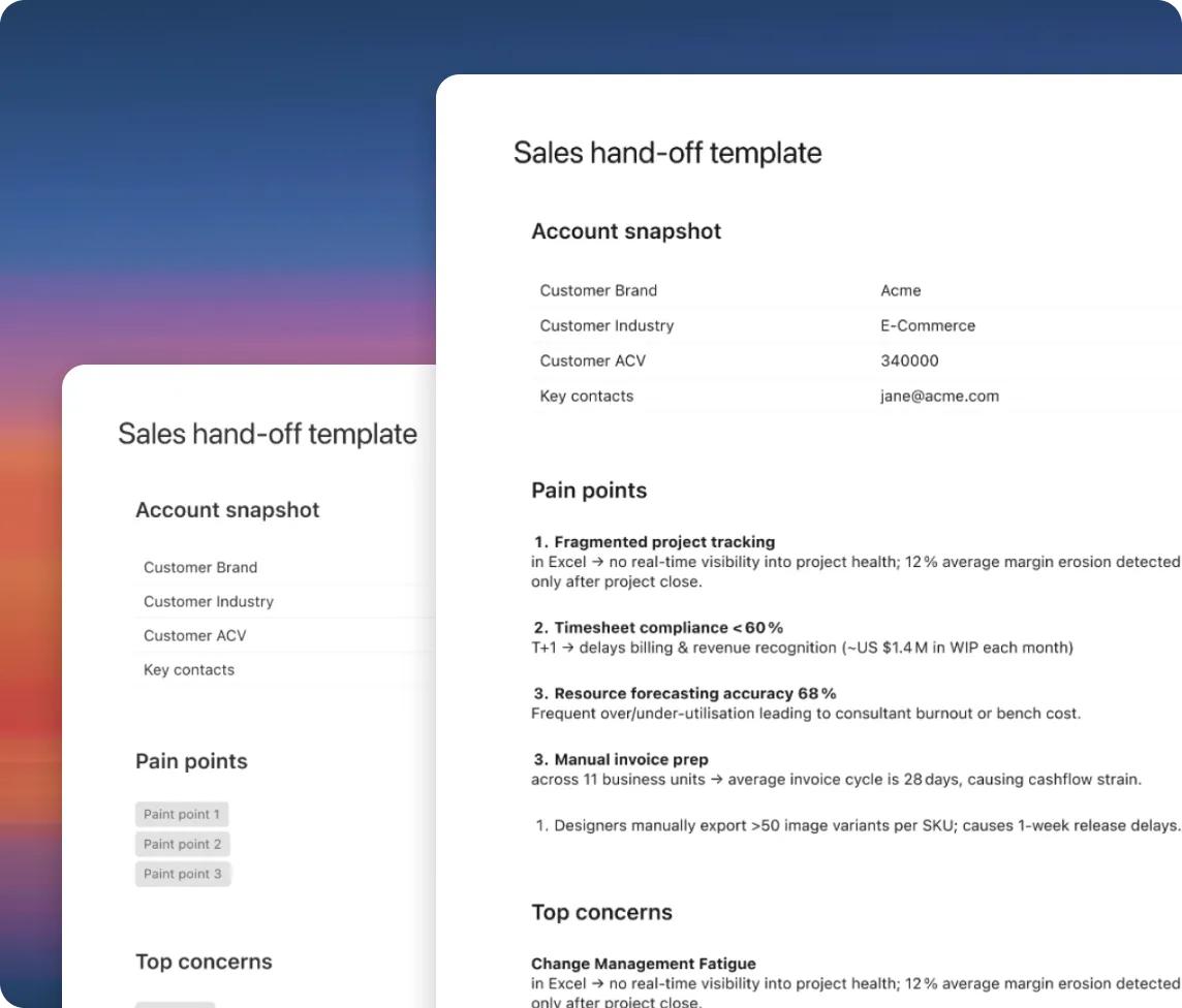 No need to reinvent the wheel with each new project. Create project plans, tasks, forms, and documents with a single click using tailored templates designed to fit different customer segments.